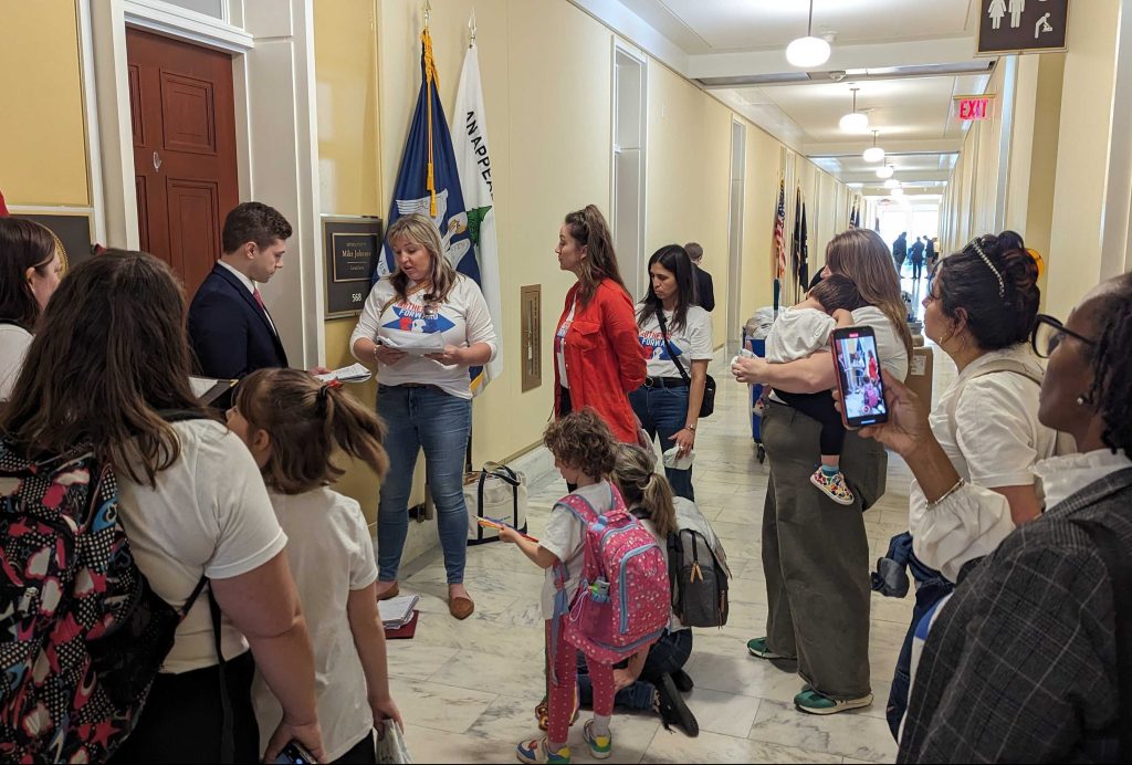 Recently, The Century Foundation released their Care Report Card to show how states are doing with taking care of its children, families, and aging populations. No surprise: it was bad. So our moms gathered at the office of Speaker of the House Mike Johnson to share exactly how “crappy” childcare is for families AND providers and to call on him to do-do better. This visit may or may not have included actual diapers filled with chocolate syrup to really drive the point home.